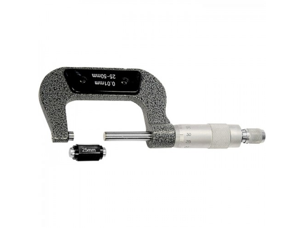 Микрометр изготовлен из инструментальной стали. Имеет форму скобы. Основным рабочим элементом является микрометрическая головка. Упакован в пластмассовый кейс. Предназначен для особо точных измерений.