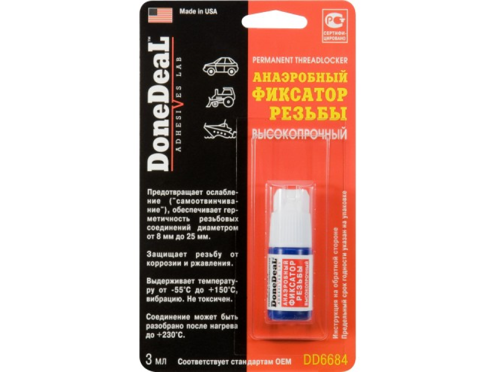 DD6684 рекомендуется для использования во всех случаях, когда резьбовое соединение должно противостоять высоким напряжениям, ударным нагрузкам, вибрациям, агрессивному химическому воздействию и влиянию неблагоприятных условий при эксплуатации. Анаэробный фиксатор для герметичности резьбовых соединений от 8мм до 25мм. Характеристики: Состав - метакриловые эфиры. Цвет - прозрачный. Термоустойчивость - от -55 °С до +150 °С. Вязкость, сПз - 600. Заполнение зазора - 0,20мм. Прочность на срез - 140-210 кг/см2 . Диаметр восст.резьбы - 8…25мм.Разборка соединения - ручным инструментом, после нагрева до +230 °С. Время схватывания - 15 мин. Время отвердевания - 60 мин. Полная полимеризация - 24ч. Область применения: DD6684 может использоваться для фиксации: шпилек блока цилиндров, коленвала, коробки передач, болтов корзины сцепления, деталей пневмоинструмента и пр. Особенности и преимущества: заполняя зазор, DD6684 способствует более равномерному распределению нагрузки; фиксирует и герметизирует соединение; предохраняет восстановленные соединения от влаги и коррозии; предотвращает ослабление и самоотвинчивание соединений.