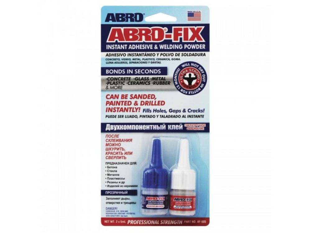 Клей ABRO-FIX имеет уникальный состав с полимерами, склеивающий на молекулярном уровне. Используется для ремонта, герметизации и заполнения отверстий в пластмассе, дереве и металле. При соединении ABRO-FIX создается более прочное соединение. Может использоваться для спаивания материалов. Преимущества: мгновенно склеивает большинство материалов; не сохнет в упаковке; сразу после высыхания можно сверлить, шкурить и окрашивать поверхность; после высыхания клей остается прозрачным; сверхпрочное склеивание.
