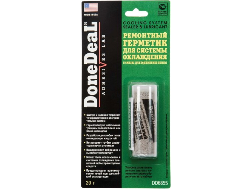 Данный высокотехнологичный состав позволяет ликвидировать течи радиатора, патрубков, краника отопителя, прокладок термостата, заглушек блока, небольшие течи прокладки головки блока. Мельчайшие волокна и металлические частицы, содержащиеся в Ремонтном Герметике, собираются в месте вытекания жидкости, "свариваются" в единое целое уплотняющими смолами с образованием стабильного уплотнения. Характеристики: Состав - мелкодисперсный алюминий и функциональные добавки. Цвет - стальной. Область применения Быстро и надежно устраняет течи радиаторов и обогревательных систем. Герметизирует небольшие трещины головок блока или блока цилиндров. Предотвращает возникновение течей при дальнейшей эксплуатации. Особенности и преимущества DD6855 разработан для любых типов охлаждающих жидкостей; не засоряет трубки радиатора и печки отопителя; выдерживает вибрацию и высокую температуру; может быть использован в системах охлаждения двигателей любых транспортных средств.