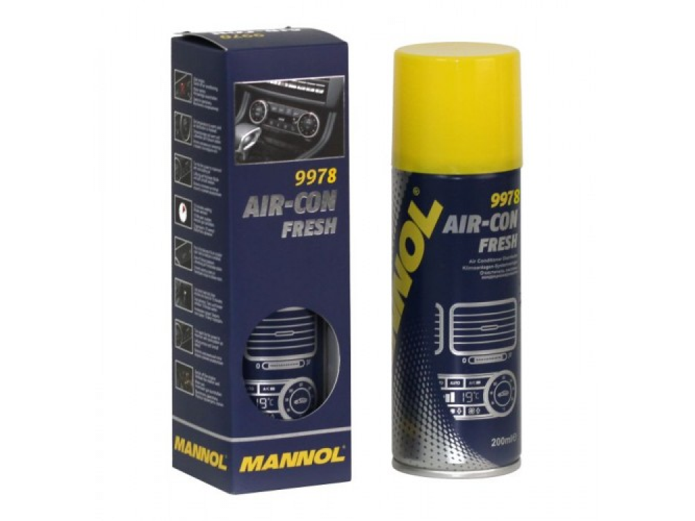 MANNOL Air-Con Fresh – средство, предназначено для дезодорации и профилактики любых типов автомобильных кондиционеров, каналов вентиляции или воздуховодов автомобилей без демонтажа салонного фильтра. Эффективно и быстро устраняет неприятные запахи, бактерии, грибковую плесень и причину их появления в будущем. Оставляет свежий приятный аромат. Этот продукт предупреждает аллергические заболевания.