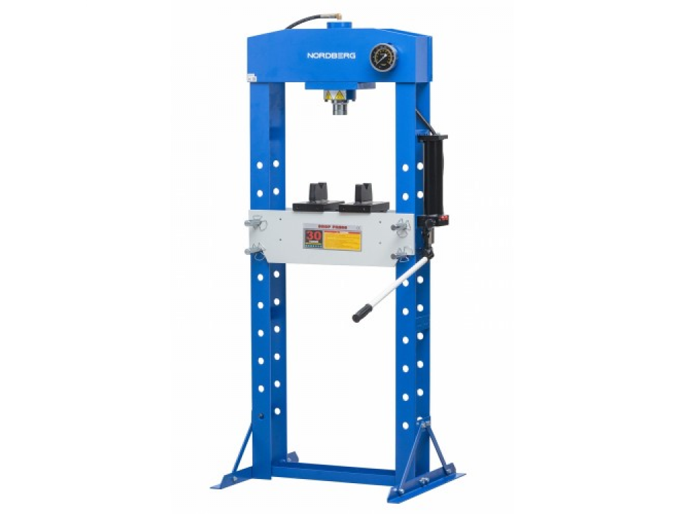 Напольный гидравлический пресс NORDBERG N3630 Описание: Надежная сварная конструкция рамы Горизонтальное смещение гидравлического цилиндра Регулируемый стол Две пластины-трапеции Гидравлический цилиндр 30 тонн. Гидравлический насос с ручным приводом. Автоматический возврат поршня. Предохранительный клапан для защиты от перегрузок. Глицеринозаполненный манометр 90 мм для контроля силы нагрузки. Поставляется в деревянном боксе.