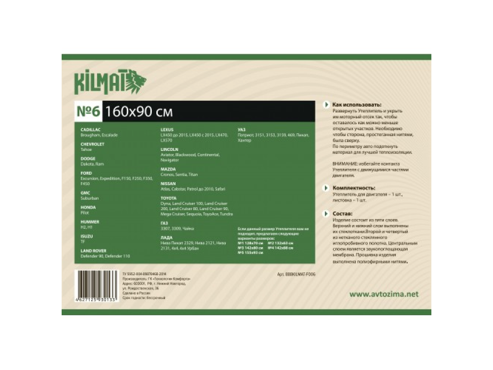 Утеплитель предназначен для более быстрого прогрева двигателя и салона автомобиля в холодное время, медленного остывания, создания комфортной атмосферы салона. Уникальная "Спрут"-технология производства обеспечивает изделию повышенную эффективность. Запатентован и сертифицирован для автомобиля. Показатели изделия: