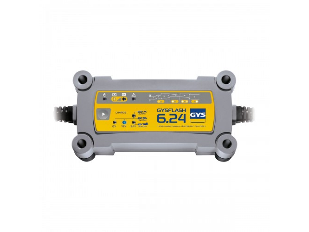 Зарядное устройство GYSflash 6.24 применяется для зарядки всех типов 6, 12 и 24В аккумуляторных батарей мотоциклов, автомобилей, внедорожников и ретро-автомобилей. GYSflash 6.24 имеет умную кривую зарядки в 7 этапов, а также специальный режим для зарядки небольших батарей емкостью до 15 Ач. Функциональные возможности: - Предназначено для зарядки всех типов аккумуляторных батарей 6В, 12В и 24В: - 6/12 В : 1,2 Ач до 125 Ач или для поддержания зарядки до 170 Ач. - 24 В : от 15 Ач до 100 Ач или для поддержания зарядки до 170 Ач. - Специальный режим : предназначен для безопасного заряда батарейки (